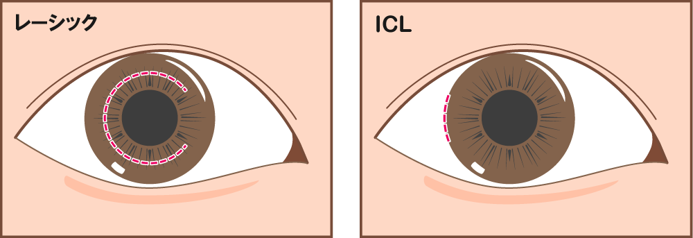 ICL は強度近視の方でも受けられます。レーシックは角膜を削る手術のため十分な角膜厚が必要となりますが、ICLは角膜が薄くても手術が可能です。